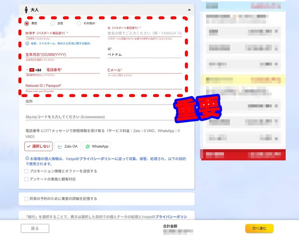 ベトジェットでの購入は、海外旅行に慣れてる人には記入も問題ないと思いますが、海外準拠の日本とは反対記入があるので慣れてない人は注意が必要ですね。