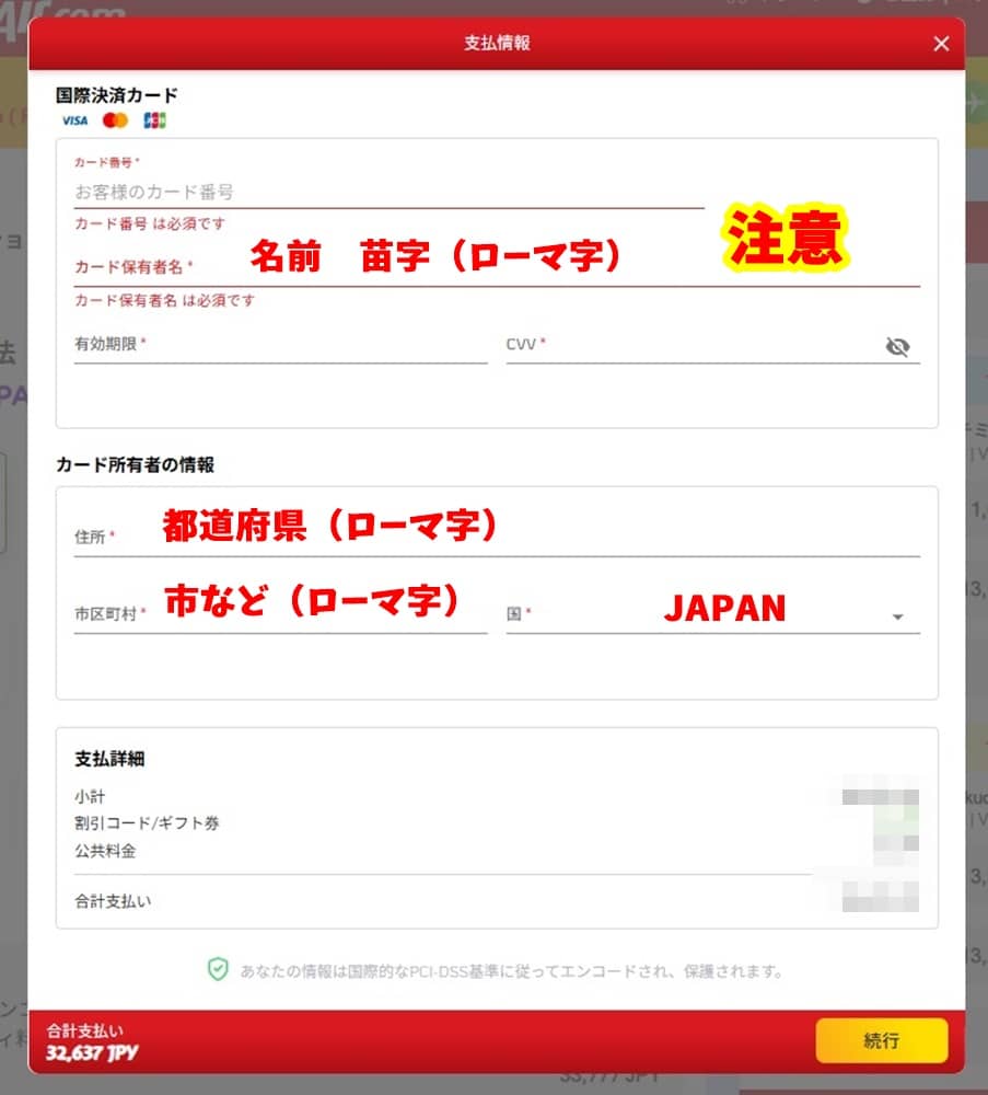 特に注意点は、搭乗者登録の記入は『苗字 名前』なのに対し、支払いカード記入欄は『名前 苗字』だったりするので、騙されないようにしっかりチェックした方がいいです。