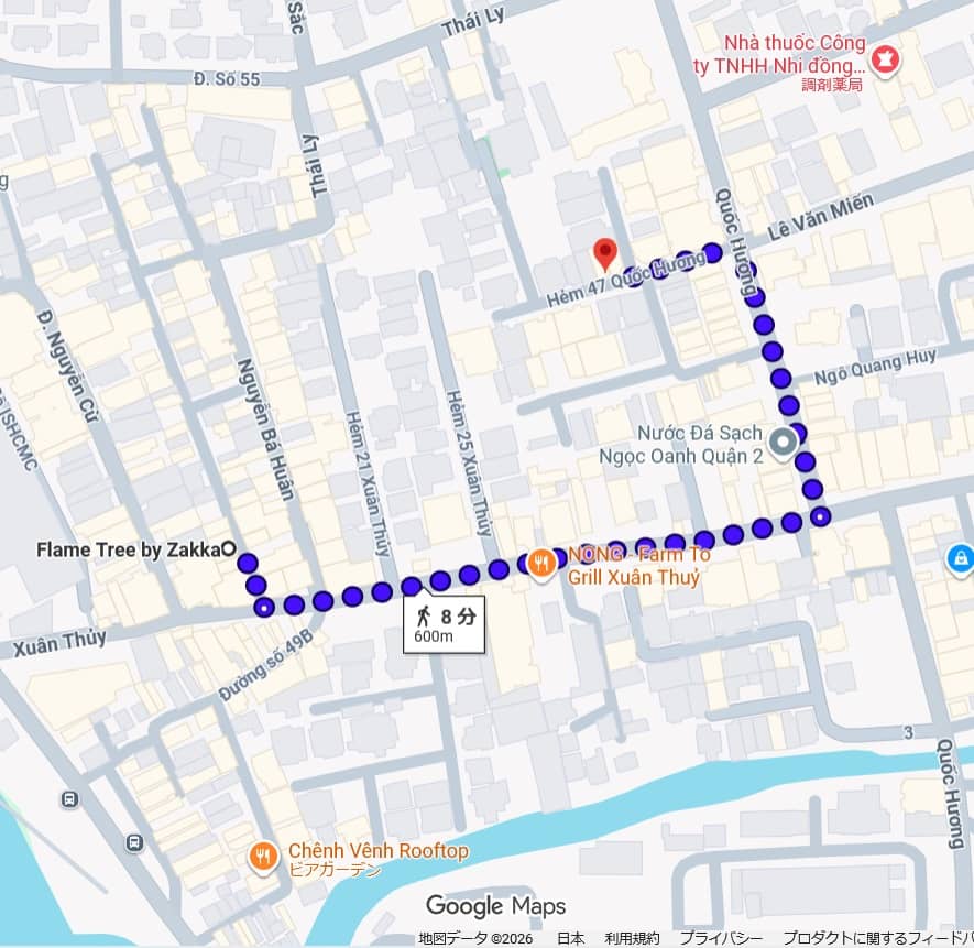 補足:こちらの店舗、私が訪れた際は、駅より東側(下記「L’Usine」そば)にありましたが、執筆時現在(26年1月)上記「Flame Tree」のそばに移転したようで、新店舗の場所で表示してます。なので私の辿ったルートとは少し変わってます。