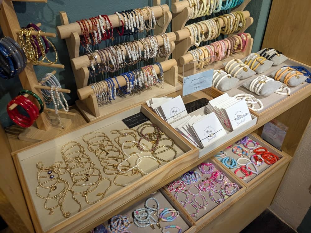 - ハンドメイドアクセサリー。カラフルなビーズブレスレットやバッファローボーンのバングルなんかもあります!